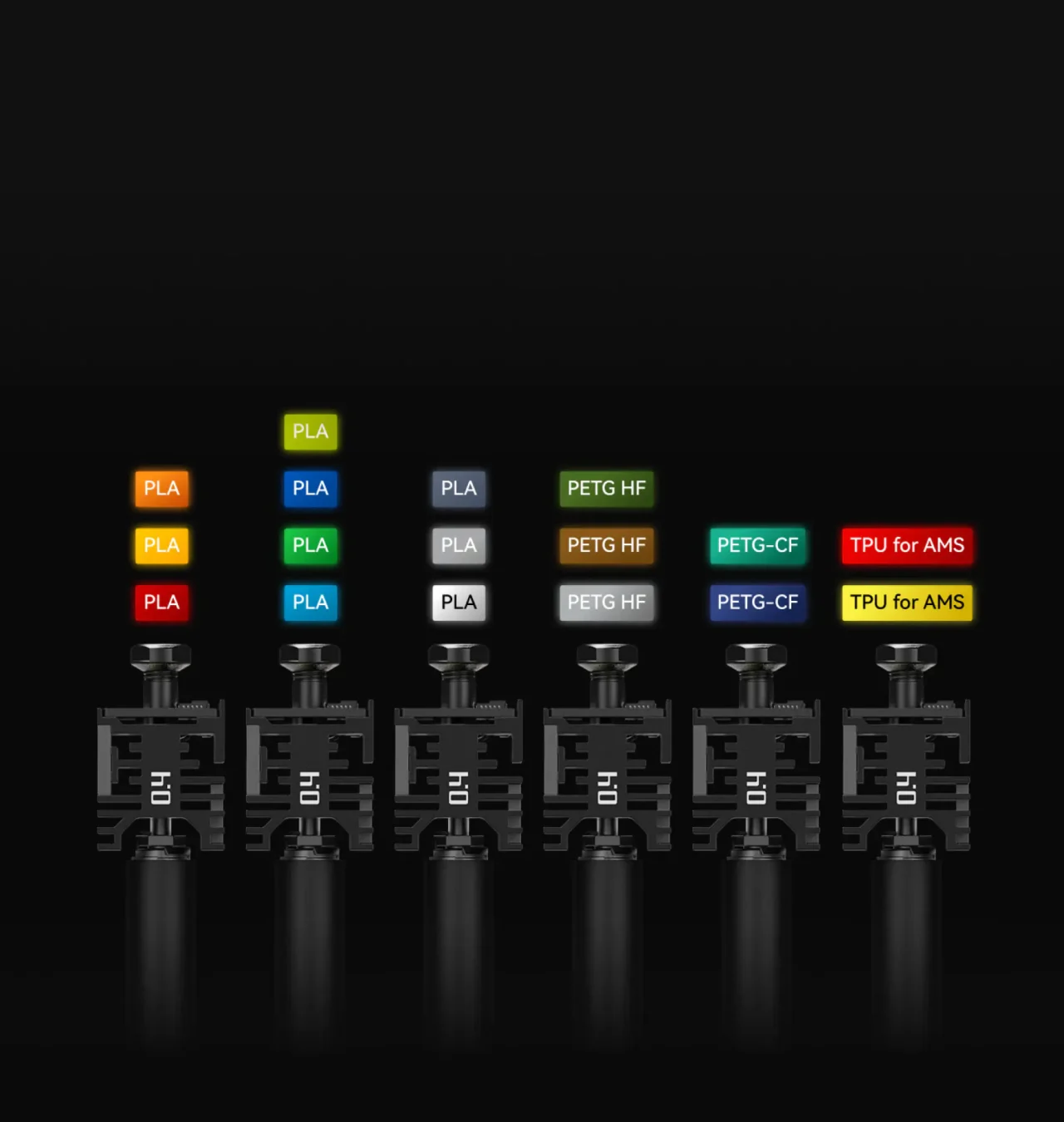 H2CのVortekシステムでは、6つの交換式ホットエンドをそれぞれ特定のフィラメント専用として設定可能。これにより、一貫した品質と信頼性を確保します。さらにホットエンドはフィラメント情報を自動保存し、次回ロード時に即座に正しいホットエンドと同期します。