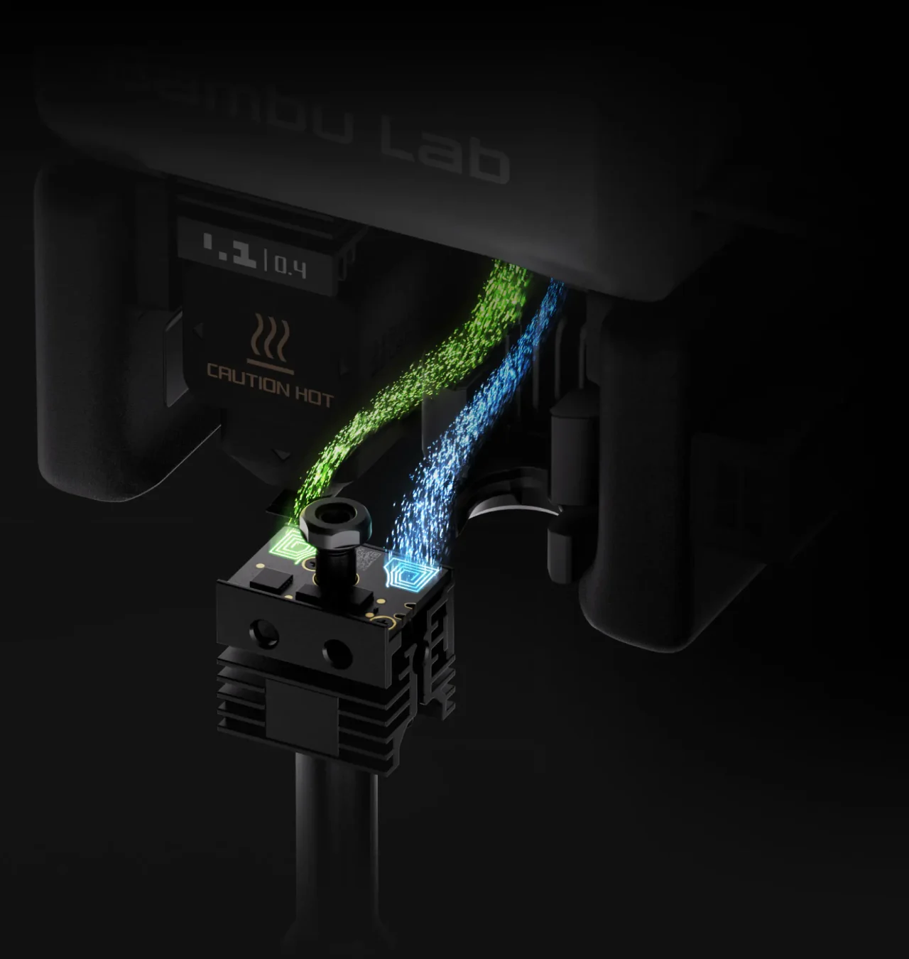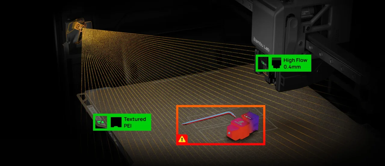 PMSMサーボ押出機は最大10kmの押出力を発揮し、一般的なステッピングモーターと比べて約70%高い性能を実現。高流量造形時の安定性を大幅に向上させます。Bambu独自のサーボアーキテクチャは20kHzで抵抗と位置をサンプリングし、フィラメントの摩耗や詰まりをリアルタイムで検知します。