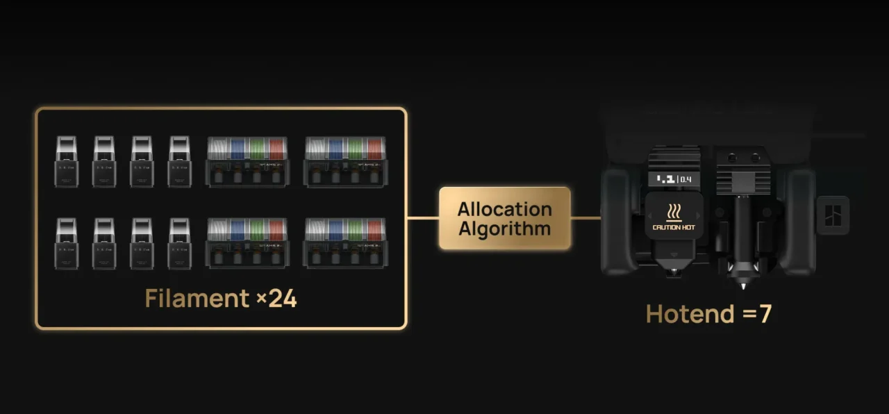 将来のプラン(2026年予定):フィラメント経路切替モジュールをリリース予定です。AMS 2 台のみで 7ホットエンドにフル対応し、左・右のフィラメント経路間で自由にフィラメントを切り替えられるようになります。