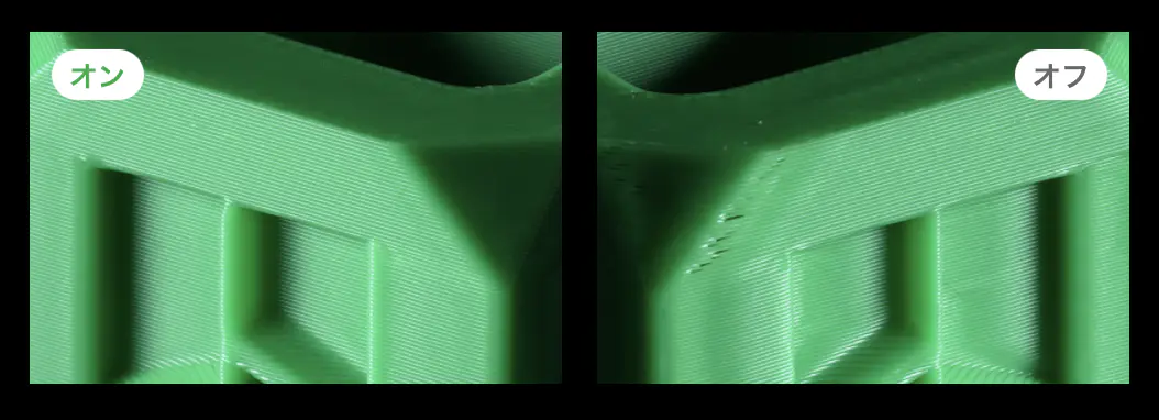 H2Cは、押出機のサーボモーターとノズルに搭載された高解像度渦電流センサーの両方の検知機能を活用し、ノズル腔内圧力を測定しながら押出を精密に制御し、各フィラメントに応じて(PA)パラメータを自動キャリブレーションします。その結果、表面の滑らかさとエッジのシャープさがさらに向上します。