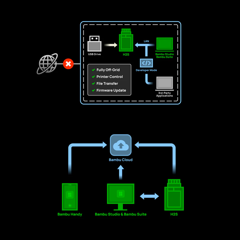 セキュリティが重要なアプリケーション向けに、完全なオフライン機能も提供し、物理的に分離されたセキュリティを確保します。ユーザーは、インターネットに接続せずにプリンターを制御し、ファイルを送信し、ファームウェアをアップグレードできます。