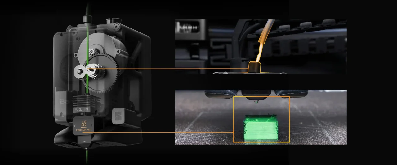 Bambu Lab独自のPMSMサーボシステムは、20kHzの抵抗と位置のサンプリングを可能にし、電磁トルクベクトルを動的に調整します。これにより、押し出しを安定化し、研削⁽³⁾や詰まりをリアルタイムでアクティブに検出します。