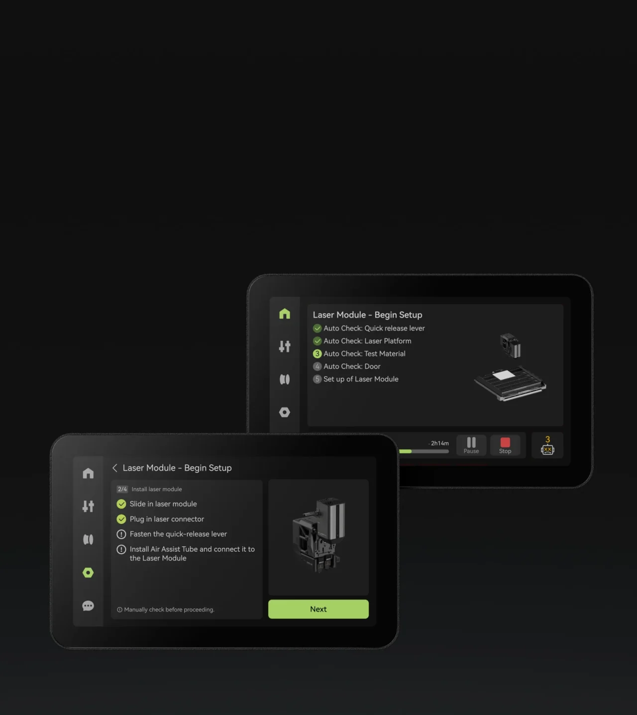 1回のタップで自動レーザー焦点検証と材料測定が開始され、手動調整が不要になります。